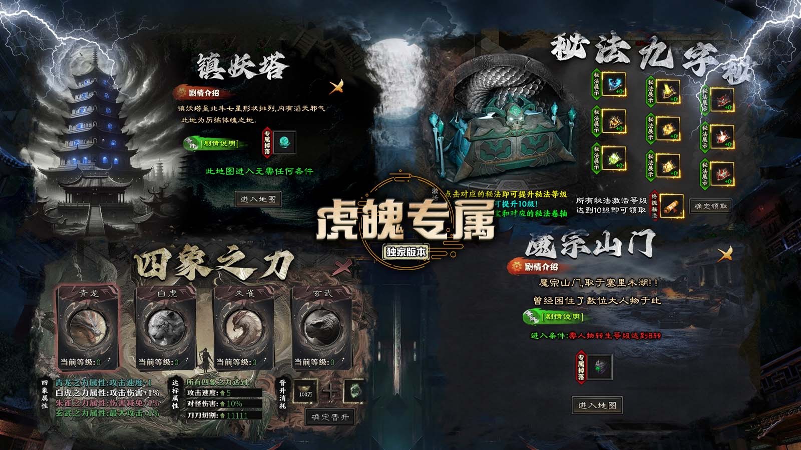 本大陆其他怪物可掉落,青龙卷,白虎卷,朱雀卷,玄武卷,可激活对应怪物克星称号,对四圣兽造成刀刀切割2000W血量!