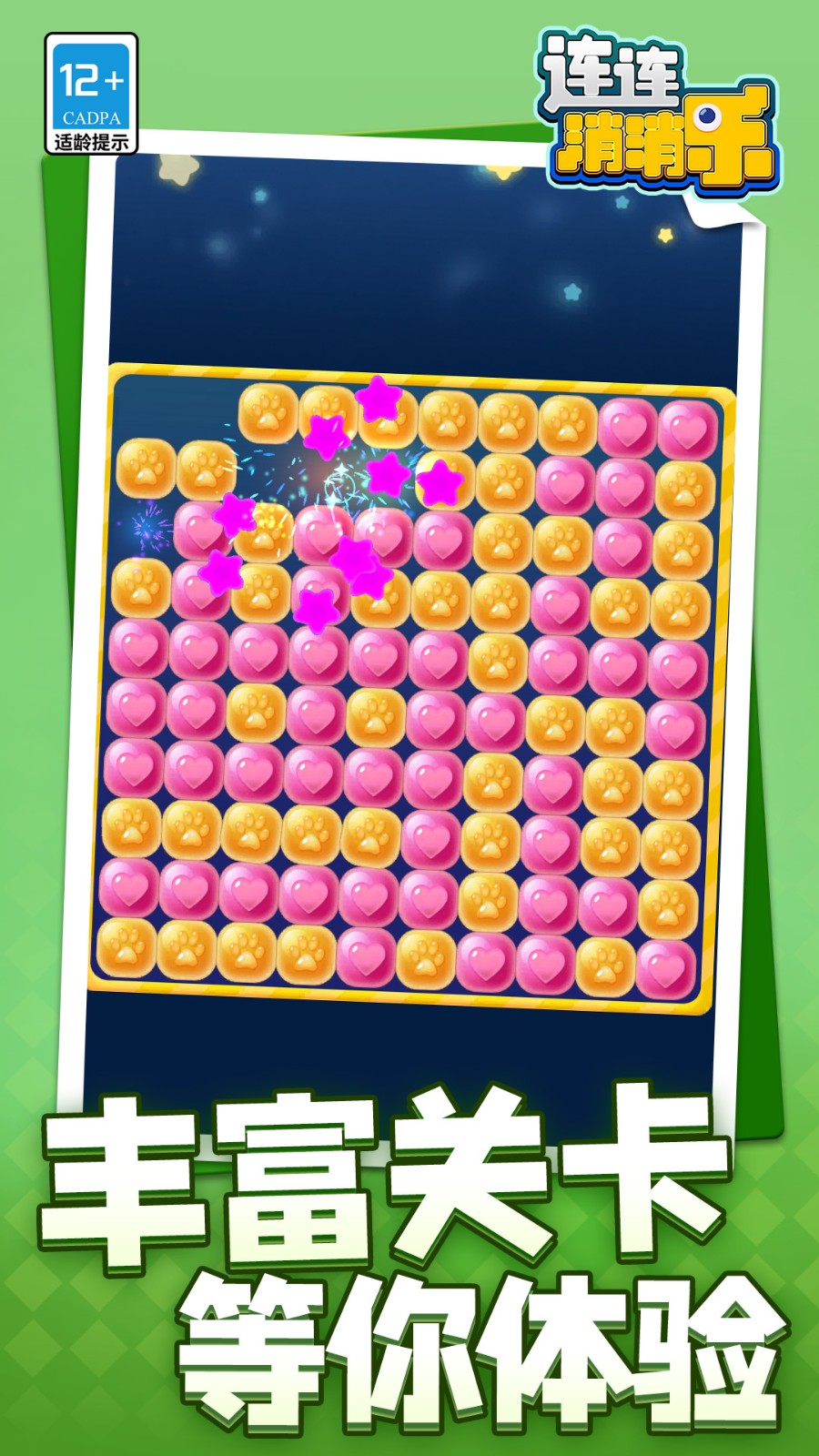 连连消消乐是一款休闲消消乐游戏,在连连消消乐中,玩家需要通过滑动手指连接屏幕上相同颜色的图案来完成消除,当达到目标分数后即可通关,清新的画面、欢快的音效和丰富的关卡设计,加上玩法简单易懂,十分休闲好玩