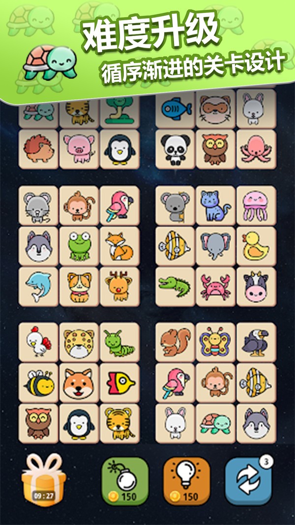 1.玩家通过触摸屏幕连接相同的图案进行消除,每个关卡都有特定的目标,在限定的步数或时间内完成。