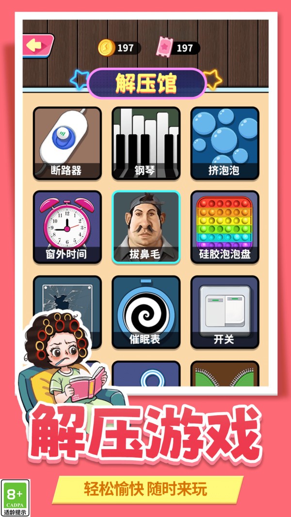 沉浸式解压神器是一款休闲益智游戏。这款游戏集合了多种不同类型的小游戏,每一种都旨在通过简单、有趣的互动来帮助玩家缓解日常生活中的压力,是玩家放松心情、享受悠闲时光的理想选择。