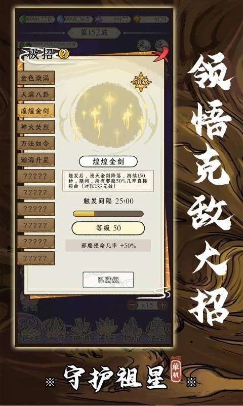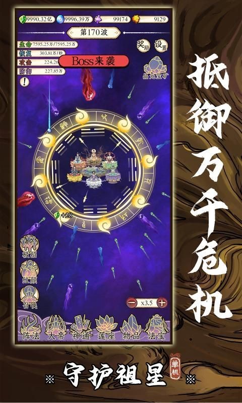 是一款非常好玩的单机游戏,融合了召唤、养成、预防、塔防等多种元素,满足玩家一次多游戏的娱乐需求,玩家所在的始祖星球遭到未知外星生物的袭击,无数危机即将来临,可以召唤飞升的天骄大帝,对抗守护祖星,还可以通过结阵、获取神通来提升法力,共同守护祖星。