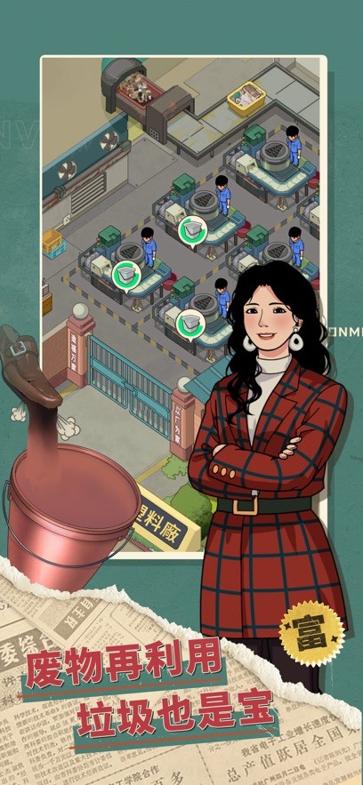 这是一款带有环保元素的模拟经营游戏,玩家经营一家废品工厂,通过不断招募员工和清理垃圾来建立各种工厂,最终成为家喻户晓的商业王,玩家在清理垃圾时可能会发现宝藏,从而获得丰厚的收入,各种废物也可以重新利用,变成有用的东西。