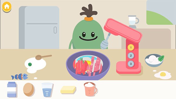 3、然后滑动画面,刚刚切好的食材就会自动移动到搅拌机,这里可以选择鸡蛋、牛奶、面粉、黄油以及水等。