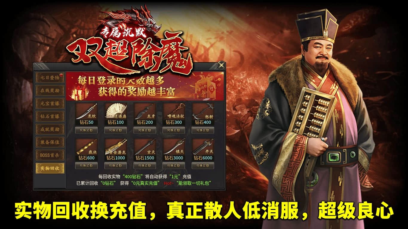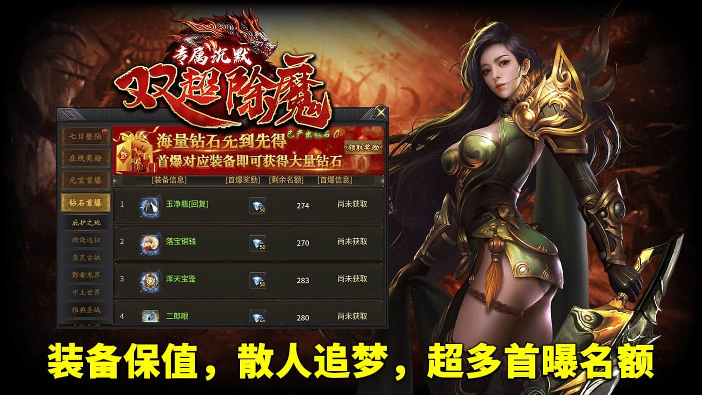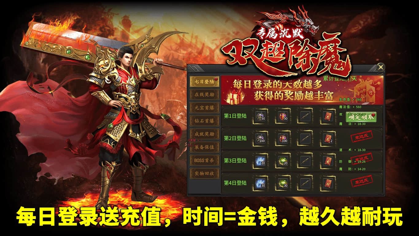 1.七日登陆、在线奖励、元宝首爆、钻石首爆、成就奖励、BOSS首杀,超多福利免费领取。