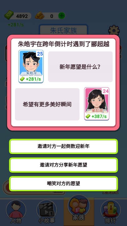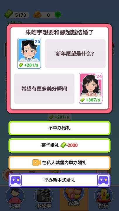游戏中的结婚系统基于家族成员的情感和社会地位。当两个角色的亲密度达到一定程度,并且符合特定的条件(如年龄、职业、财富等),他们可以结婚。结婚后,玩家可以选择是否举办婚礼,婚礼的豪华程度也会影响家族的声望和未来的收入。