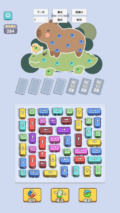 真上头鸭是一款拔螺丝+挪车消除闯关游戏,在真上头鸭中,结合了拔螺丝解谜与挪车消除两种经典玩法,让你在轻松愉快的氛围中锻炼逻辑思维与空间感知能力。