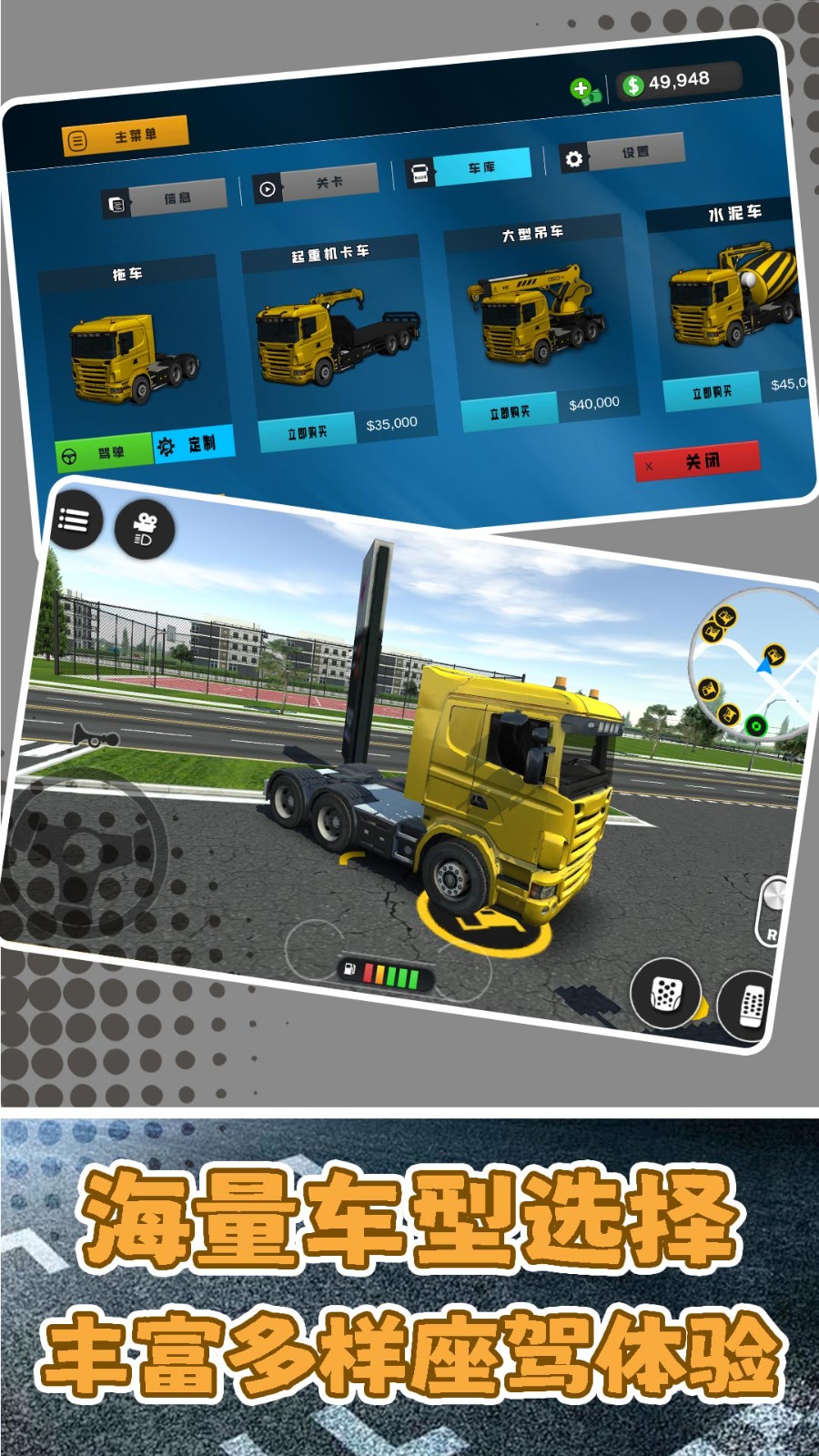 3.玩家将操控多种类型的重型车辆,包括但不限于大型货车、混凝土搅拌车、起重机卡车等