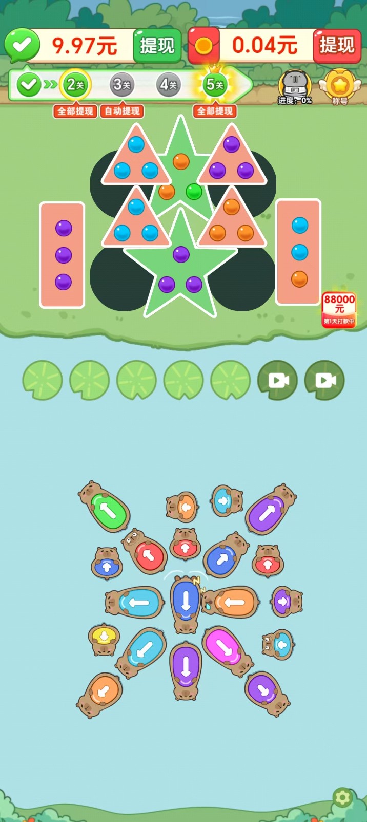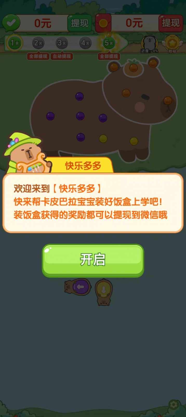 快乐多多是一款可以赚钱提现的休闲小游戏,在快乐多多中,玩家需要给所有的卡皮巴拉装好盒饭即可成功通关,将同色的点点装入同色的饭盒中即可,按照卡皮巴拉饭盒的指定方向划出即可,前方有障碍时卡皮巴拉无法出动哦