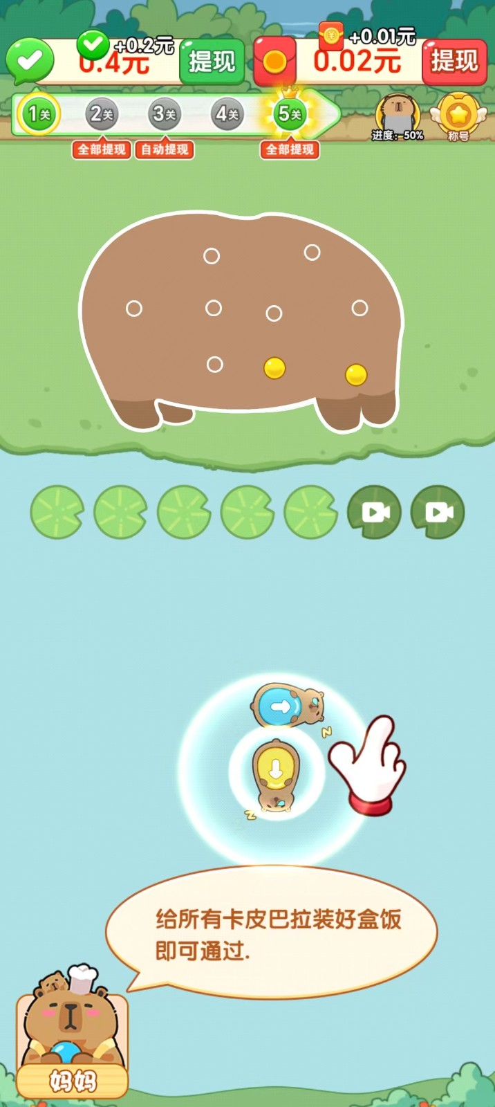 1.帮助卡皮巴拉宝宝装好盒饭上学,给关卡中所有卡皮巴拉装好盒饭后即可通关