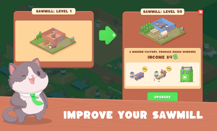 猫伐木是一款充满乐趣和创意的休闲闲置点击游戏,在猫伐木中,您将与可爱的猫咪们一起踏上一次异想天开的冒险旅程。猫咪们化身为伐木工,在充满活力的森林中砍伐树木、收集资源,探索隐藏的宝藏,享受轻松愉快的游戏体验。