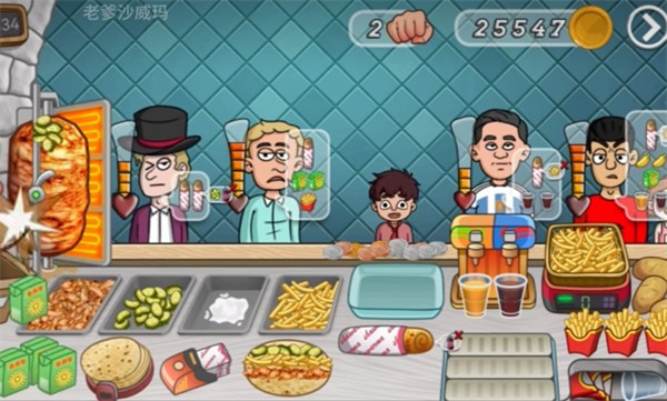 老爹沙威玛汉化版将玩家带入一个充满美食和欢乐的沙威玛餐厅世界,玩家将扮演餐馆老板的角色,亲自烹饪各种类型的沙威玛(一种卷饼或三明治)和其他美味菜肴,为前来光顾的顾客提供高质量的服务,玩家还需要处理餐厅的日常运营,包括采购食材、招聘员工、装修店铺等,确保餐厅的顺利运营。
