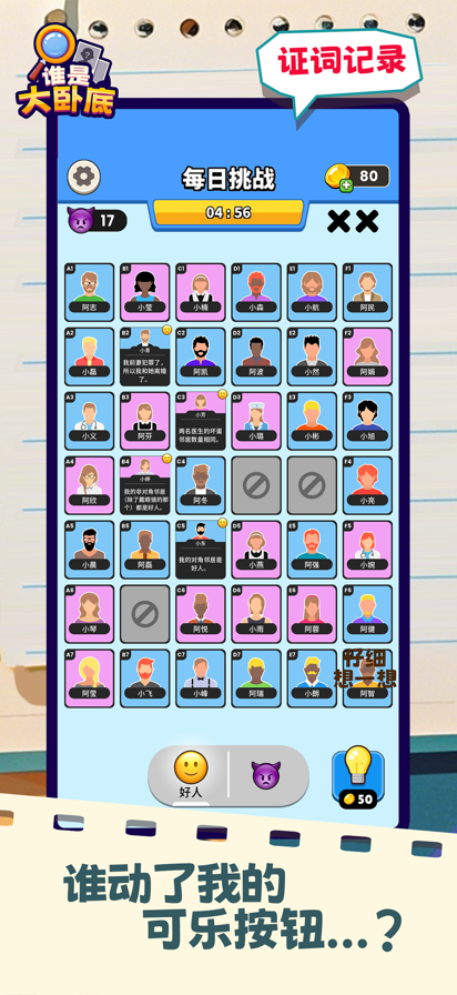 游戏中所有的好人和一部分坏人在被发现身份后都会给玩家提供一些线索,而这些线索还都是比较详细的,比如告诉玩家某个人是好人,某个人和他是同伙,某一行或某一列有多少坏人等类型的线索,在保证玩家可以顺利游玩的情况下,还是有一定的挑战性,这些对于这个小游戏来说还是挺不错的