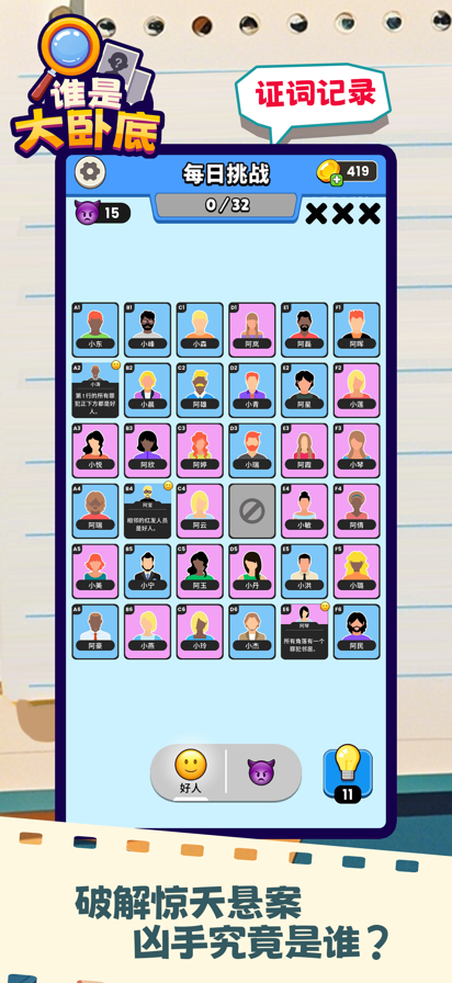 谁是大卧底是一款推理解谜类的智力游戏,在谁是大卧底中,玩家需要在多个人物以及复杂的关系中找出罪犯、保护无辜者,游戏的整体画风做的相当简单,整个游戏就只有一些没有五官的头像图片,和一些文字描述,玩家需要根据这些描述来获取线索,完成推理,找出犯人