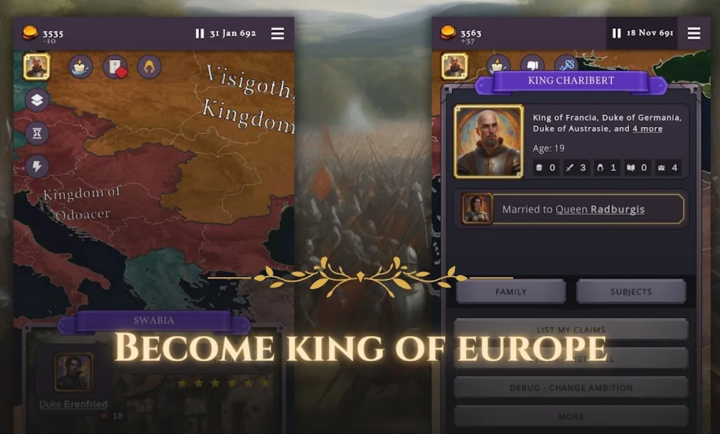 4.通过婚姻、征服和阴谋来建立你的遗产。您可以通过与新的强大盟友的女儿结婚来开始您的王朝,然后使用王朝技能将特权传递给您刚出生的儿子,然后通过精心组织的阴谋惩罚叛徒!或者玩战争游戏,以欧洲及其王国为游乐场。成为中世纪世界的征服者