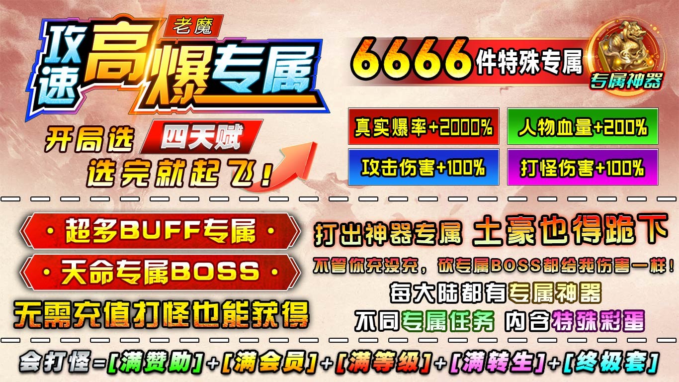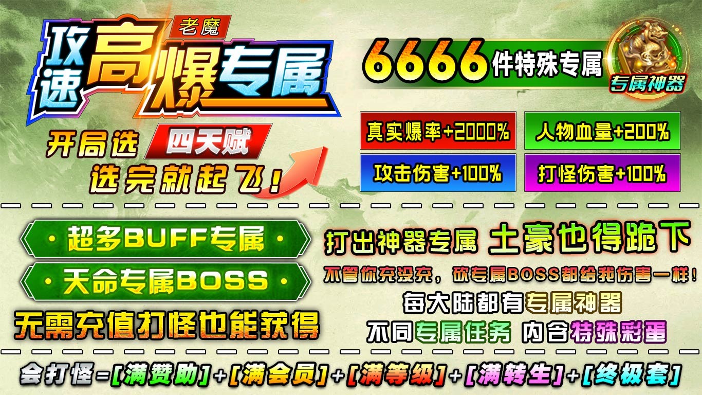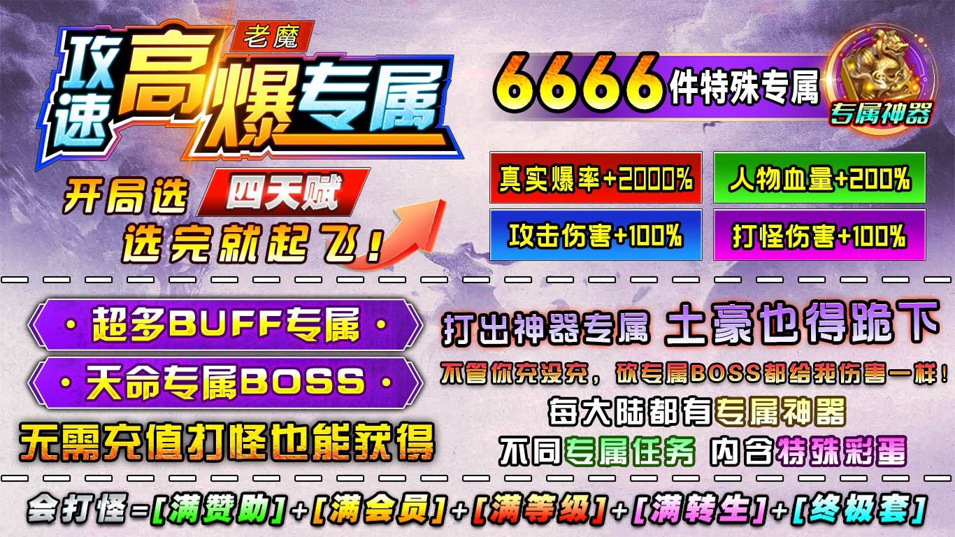 老魔攻速高爆专属是一款1.85神器传奇手游,在老魔攻速高爆专属中,所有道具、装备、材料、货币均可在本服内获得,无任何必须要充值的地方,散人也能享受最顶级的体验。
