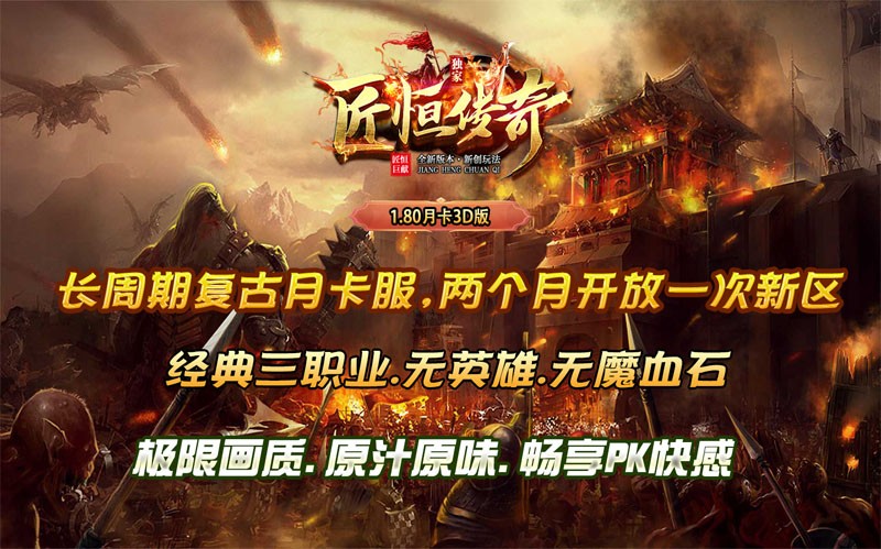 匠恒180月卡3D是一款复古三职业传奇手游,在匠恒180月卡3D中,三职业平衡且相互克制,纯靠玩家手法,游戏内无英雄、无魔血石,纯复古画面一张月卡打天下,一张月卡就可以畅玩玛法大陆