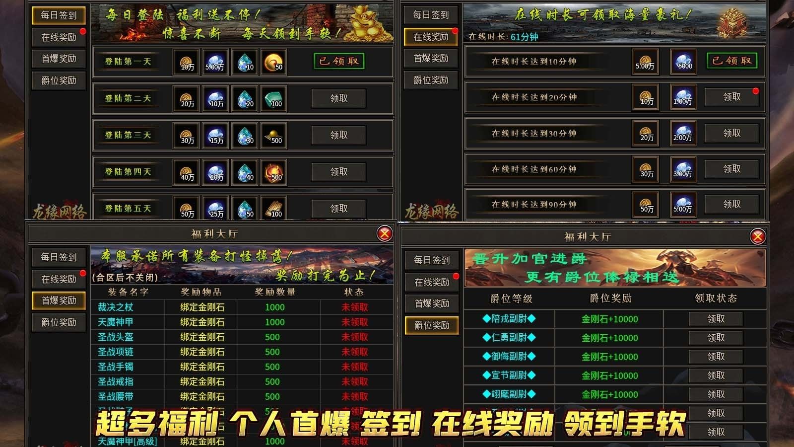 龙缘极速大极品是一款三端互通的大极品传奇手游,在龙缘极速大极品中,上线就送自动回收、自动拾取,还有满背包、满仓库,赞助也能免费领,开局攻速拉满,打怪满地爆装,各种充值、奖励疯狂送