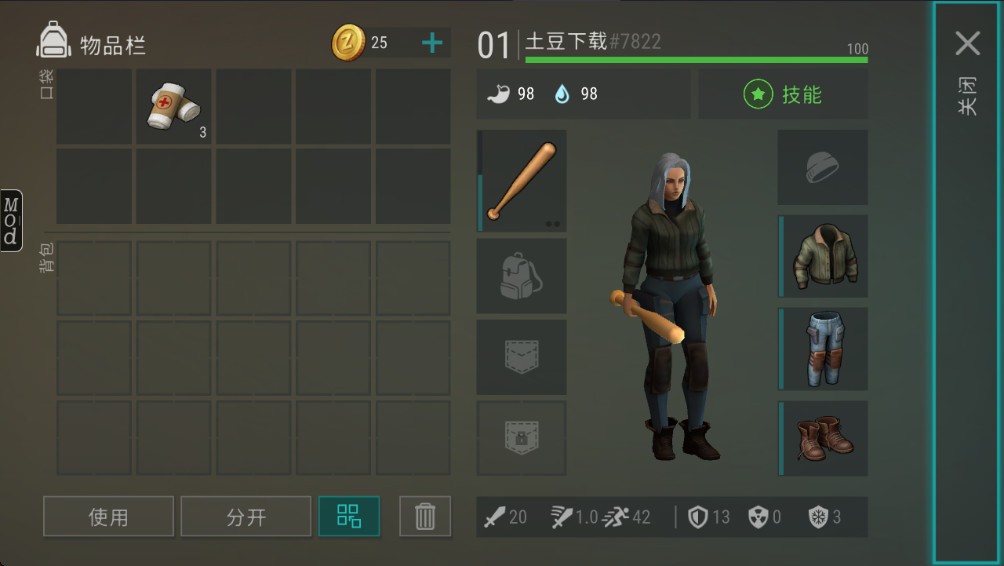 4.新手刚玩容易被饿死或者渴死,第一次玩,邮箱里会送2瓶水,水可以解渴,喝完了空瓶别扔,后面可以建造一个雨水器,可以把空瓶子放雨水器里面,这样就能不断产生水了。