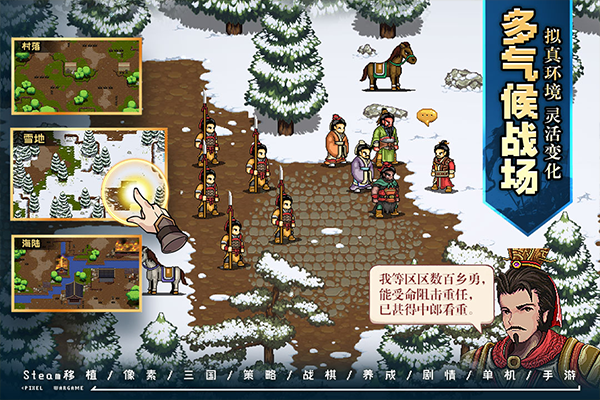 3.采用传统的回合制战棋玩法,加入了“迷雾系统”“天气系统”“时辰变化系统”等创新元素。