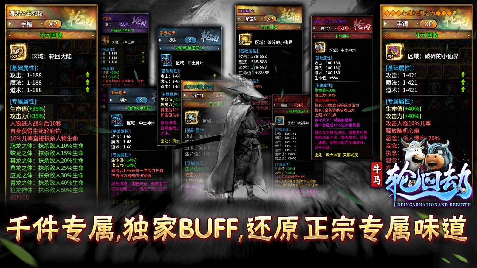 牛马轮回劫是一款大型剧情沉默传奇手游,在牛马轮回劫中,有上千件专属以及独家BUFF,为玩家打造最正宗的专属味道,超大生态货币通换,剧情探索惊喜不断,BOSS云集散人天堂,真实爆率所有装备全靠打