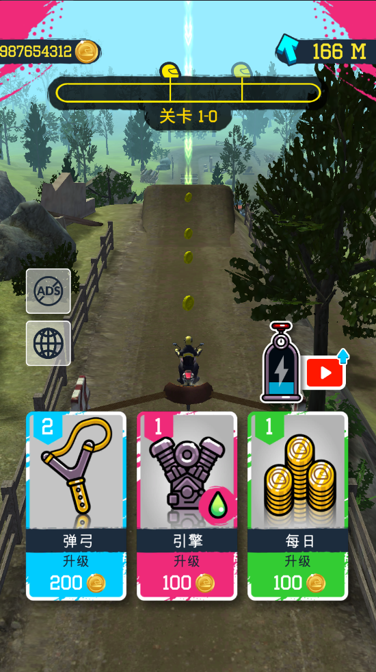 5.还可以对弹弓和摩托车引擎进行升级,让摩托车跑的更远