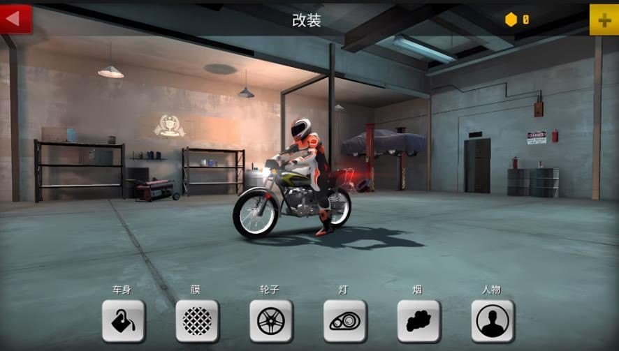 1.玩家可以进入改装界面,对摩托车的车身、轮子、灯光等部件进行个性化改装,打造专属座驾