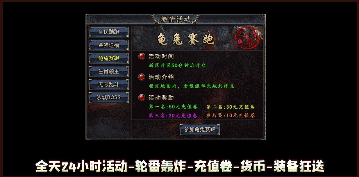 4.唯一赞助均可通过本服内获取的货币购买!不卡任何玩家!时间决定一切!5.全天24小时精彩活动,激情跑酷-龟兔赛跑-金猪送福-生肖领主-沙城BOSS-奖励拿到手软6.本服内BOSS超多,每个地图均有BOSS刷新时间以及位置标记,地图超多,散人必选