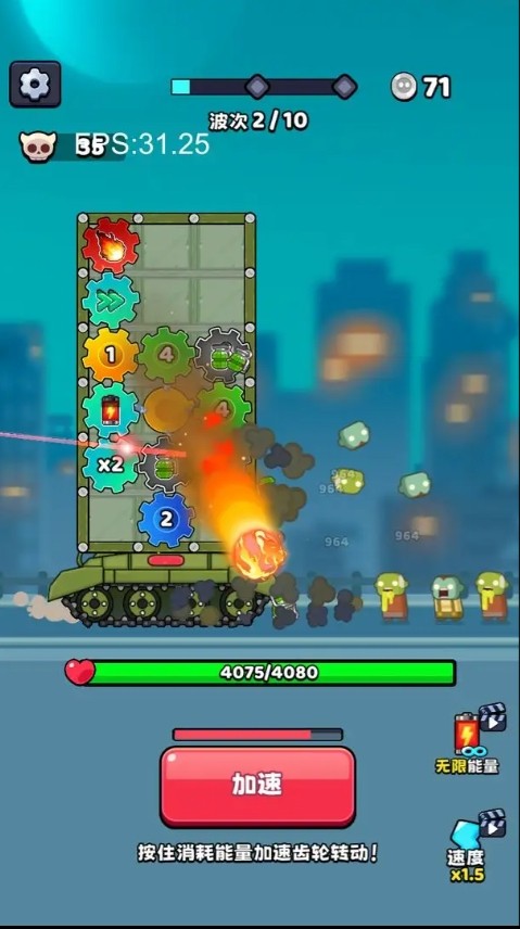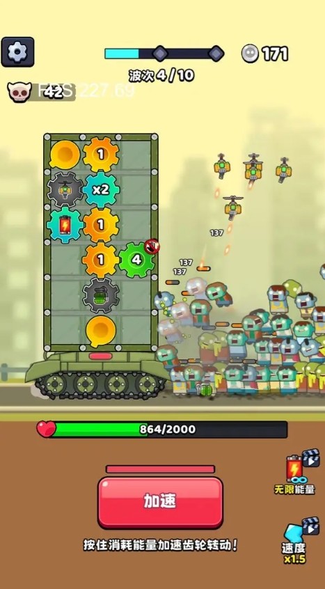 2.注意僵尸类型,例如面对高速僵尸时,可增加减速齿轮;对抗高血量的Boss时,优先叠加暴击齿轮。