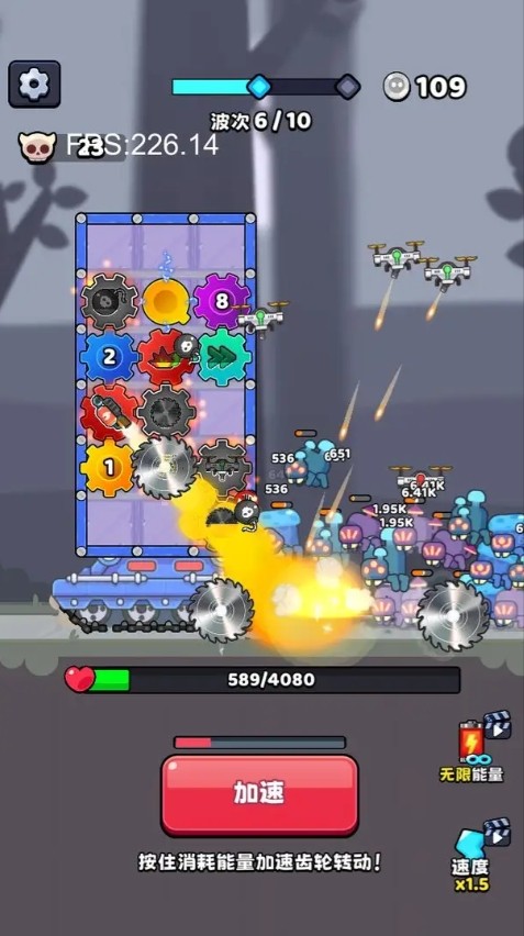 每局游戏生成随机机械组合,支持导入自定义图案,打造专属齿轮战车,击败来袭的敌人,赢得丰厚奖励。