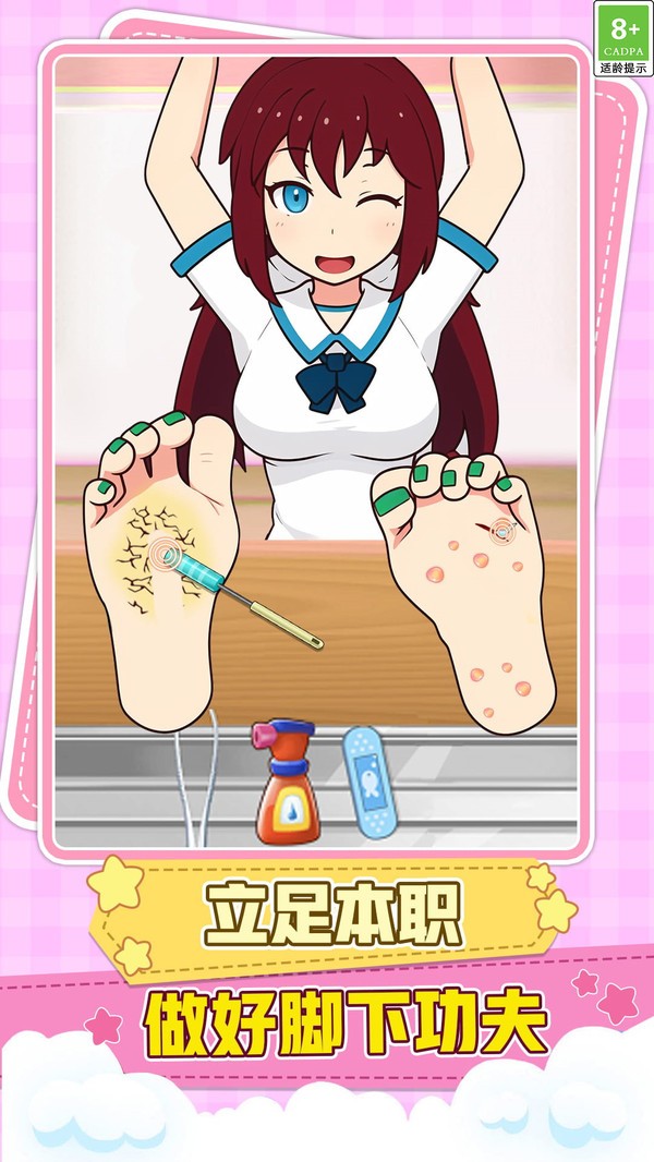 1.背景设定在一个普通的修脚店,玩家的任务是为各种可爱的小姐姐们解决脚部问题。