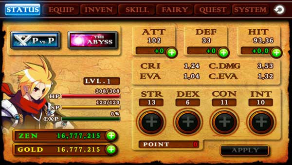 角色属性:HP(生命值),SP(能量),STR(力量),DEX(敏捷),con(状态),INT(智力)