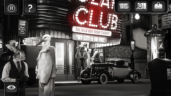 1、独特视觉风格:手绘赛璐璐画风搭配高对比度色彩与低饱和滤镜,重现 1940 年代好莱坞质感,光影天气强化戏剧性。