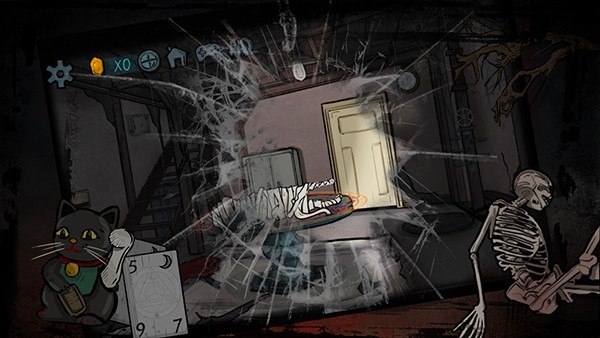 62、刚擦干净的血迹下面有一张密码纸,这个密码也就是刚找到的箱子的密码,上面写着blood,然后在每行把相对应的字母找到,b=3,l=2,0=4,0=1,y=5,然后按顺序点击盒子上的按钮。得到一个头颅,取出头颅里的黑色猫眼,把猫眼装到猫上。