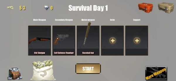 1、进入游戏后,在初始武器选择界面,可根据自身战斗习惯,搭配主武器、副武器和近战武器,搭配好后点击 “START” 开启生存挑战。