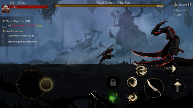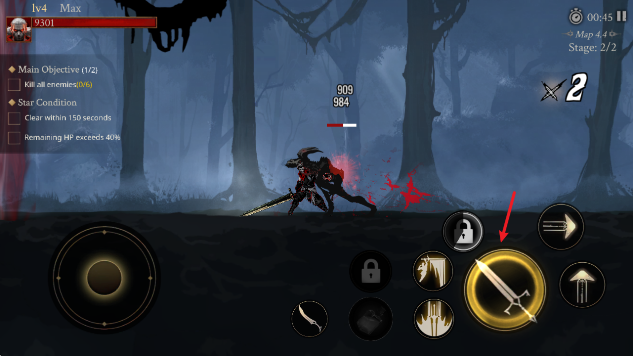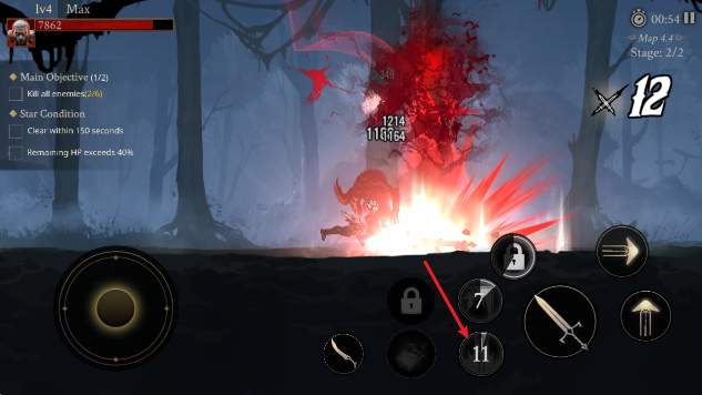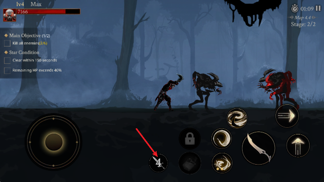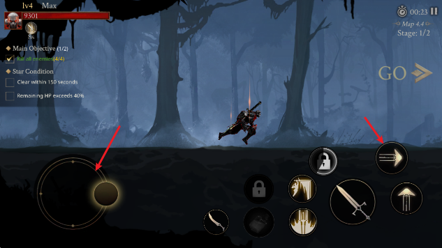 1、通过左侧的摇杆控制角色移动,点击右侧的箭头即可瞬移。