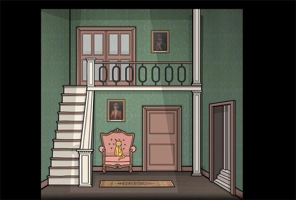 延续锈湖系列标志性的粗线条手绘画风,采用冷暖对比强烈的色彩营造不和谐感。宅邸内部布景压抑,染血的楼梯、窥视的眼睛等细节强化心理恐怖氛围。
