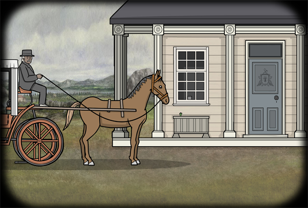 1、玩家将以仆从的身份开始游戏,点击继续,首先在马车上,根据提示可以拉开窗帘看看。