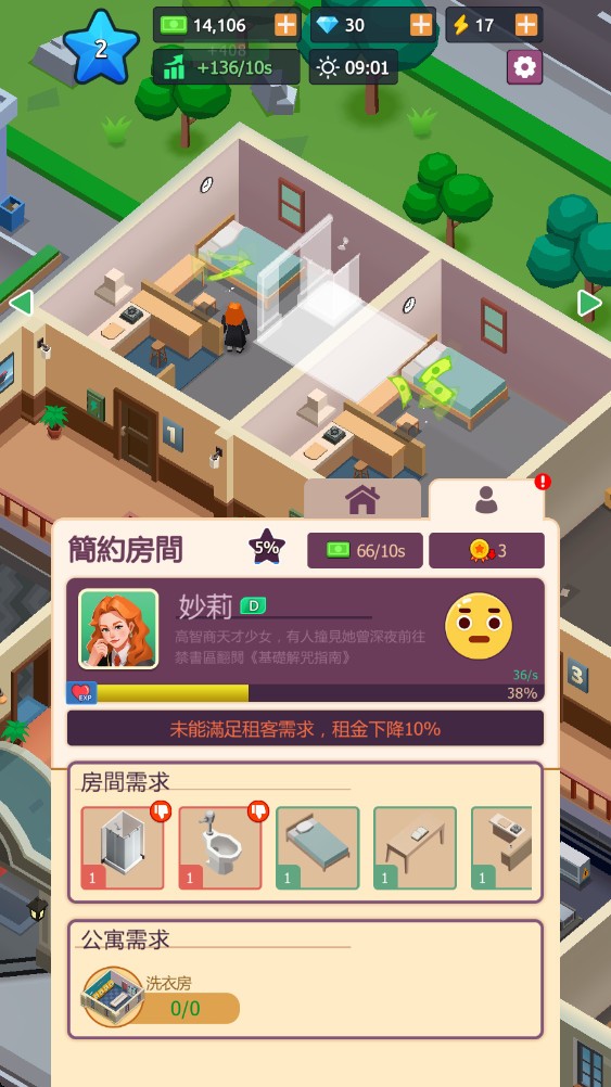 2.首先解锁第一个房间简单装饰一下,就可以招揽租客了。