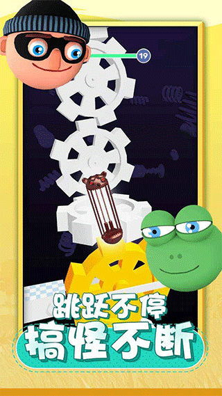 2、幽默音效与物理反馈,角色跳跃时伴随夸张的“嗷呜”“咻”等音效,失败时触发搞怪动画。