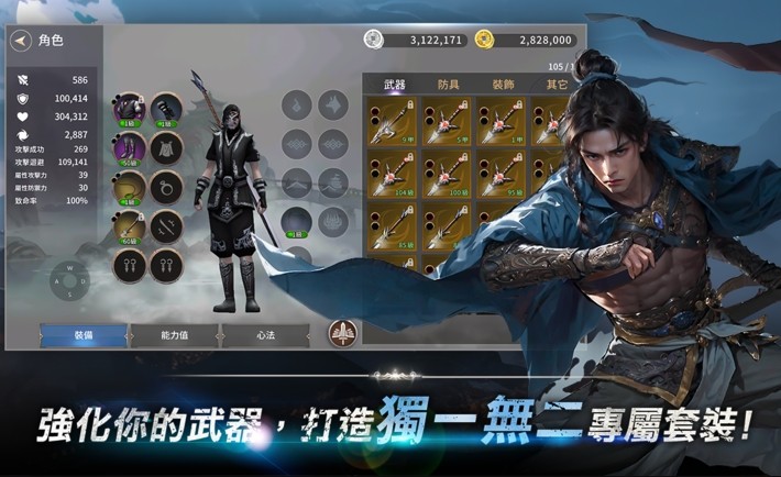 3、装备分为普通、宝物、明器、神器四阶品质,支持材料强化、组合与转换,打造专属神兵。