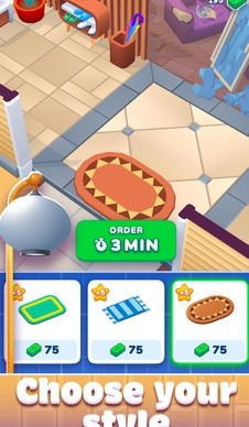 2、资源管理,通过收集木材、石材等材料,或完成任务赚取金币,用于购买家具和升级工具。
