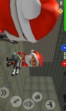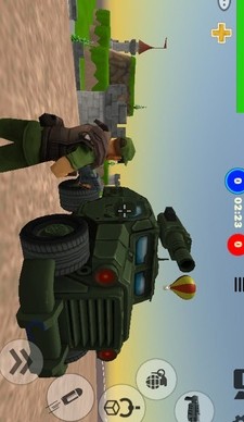 2、然后进入游戏,左上角加号是菜单,打开了就能选择里边的东西建造。有锁的是要从商店买的,然后右上角那个枪点一下是可以换的,前提是等级够并且有这个枪,然后飞机和车啥的出来了就走到边上出现一个们的图标点一下就上去了。然后还有按住跳跃键可以飞,要注意上面的蓝圈,空了就是没有燃料了,出现英文然后就飞不了了。