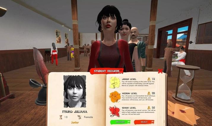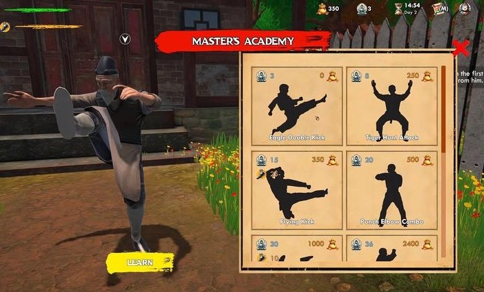 2、技能传承与升级,向大师学习新招式后,需及时传授给学员,并通过小游戏提升技能熟练度。
