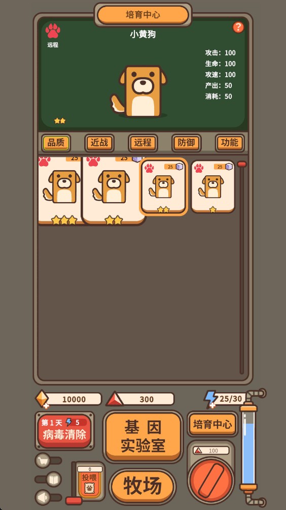 2.点击“培育中心”,可查看动物(如小黄狗)的属性(攻击、生命、攻速等),并进行动物培育相关操作,提升动物品质。
