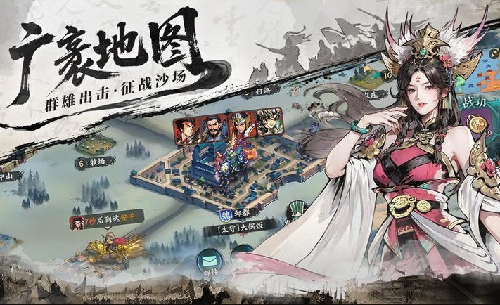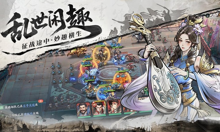 2、水墨国潮美术风格,从城池建筑到战场特效均呈现水墨丹青的视觉效果,精细渲染乱世沙场,武将立绘融合传统工笔技法与现代审美。