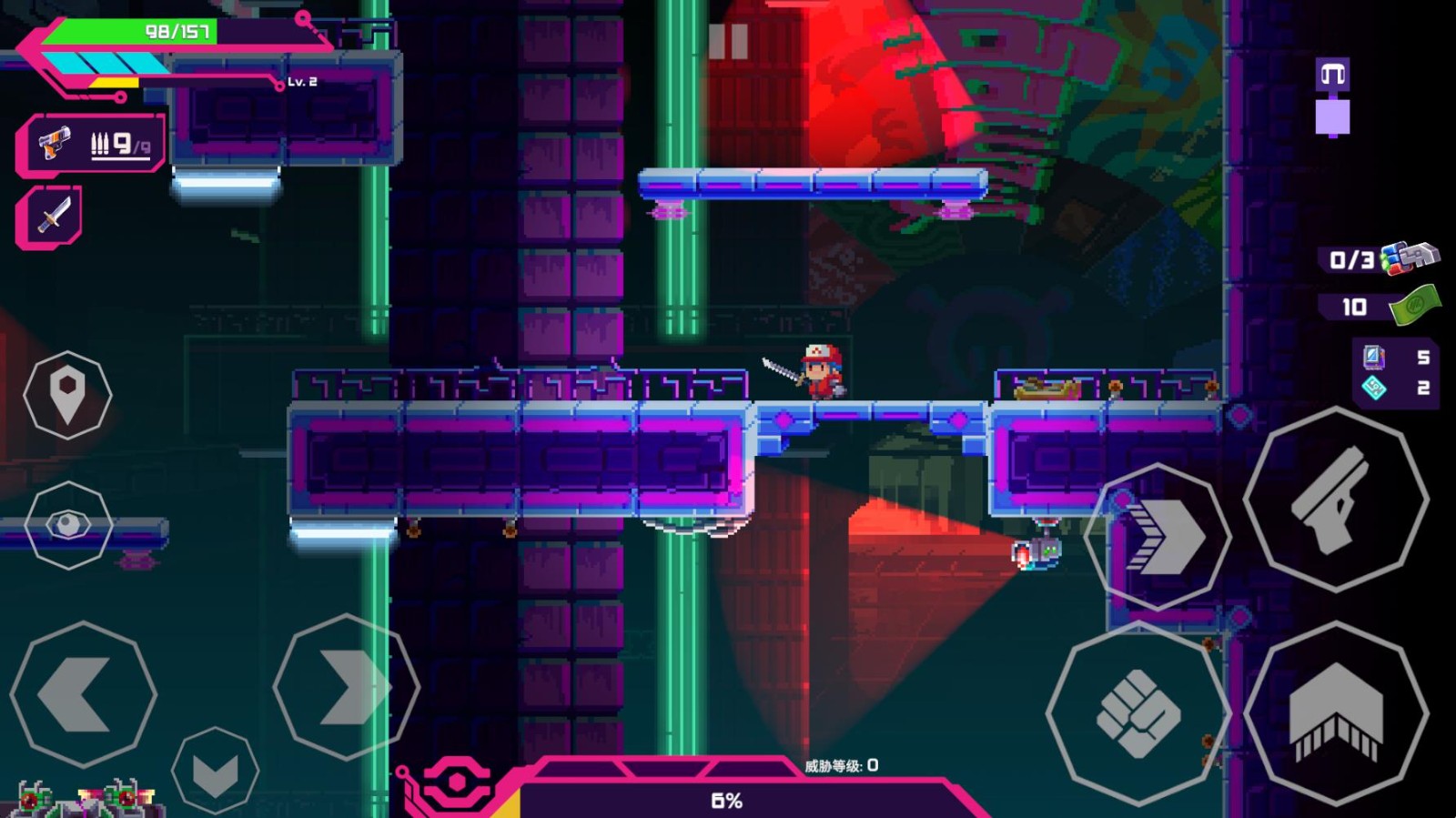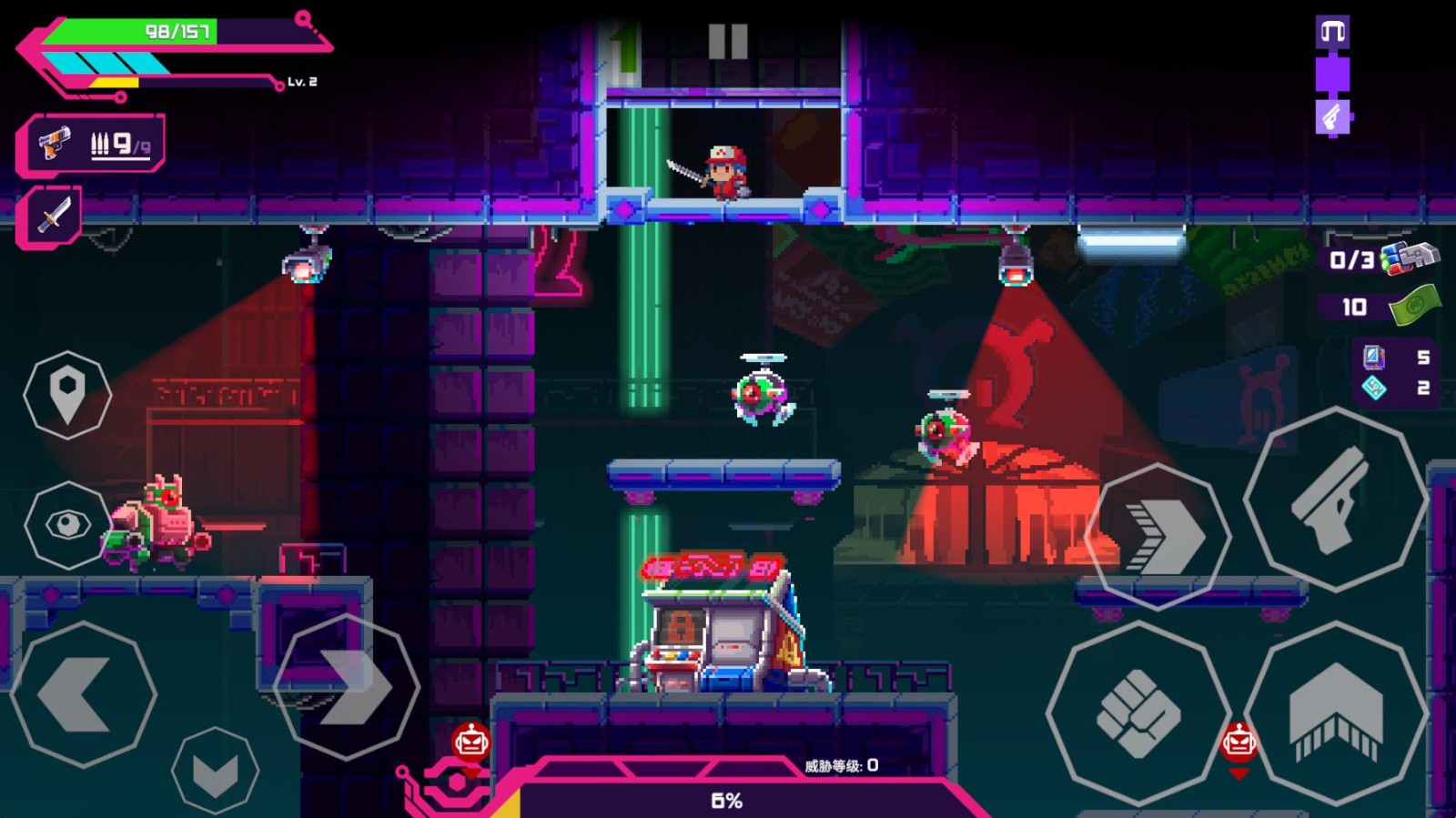 3、在闯关过程中击败敌人会获得经验和金币,当被摄像头照到后会提升警戒度。