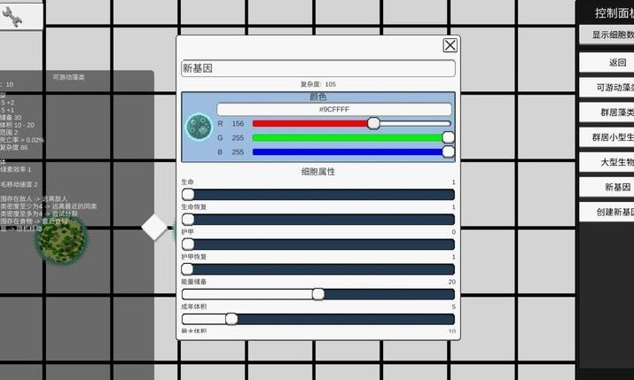 4:点击右侧控制面板“创建新基因”,进入基因编辑界面,可调整新基因的颜色、细胞属性(生命、护甲、能量储备等)。