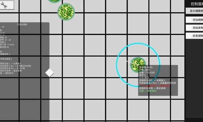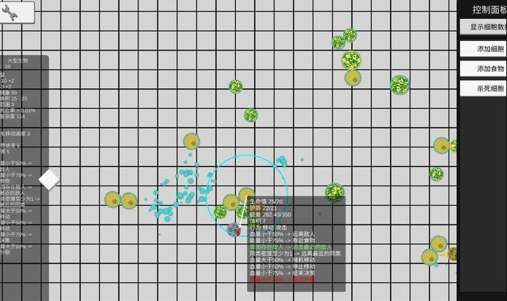 3:观察细胞的行为,如移动、攻击等,左侧会实时更新细胞的状态和行为逻辑,帮助玩家了解生态系统的运行。