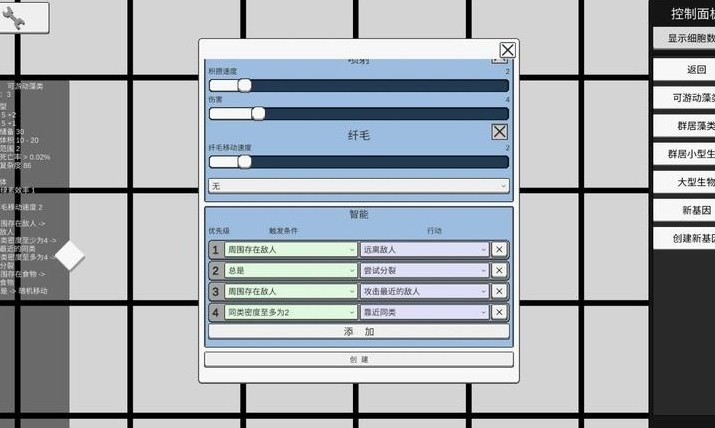 5:在基因编辑界面,进一步设置细胞的“喷射”“纤毛”属性,以及“智能”行为的优先级和触发条件,如周围存在敌人时远离或攻击,同类密度情况等,完成后点击“创建”生成新基因,推动生物演化。