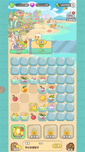 1、进入游戏后点击右下角的沙滩按钮来进行合成,将相同的物品放在一起就可以合成。